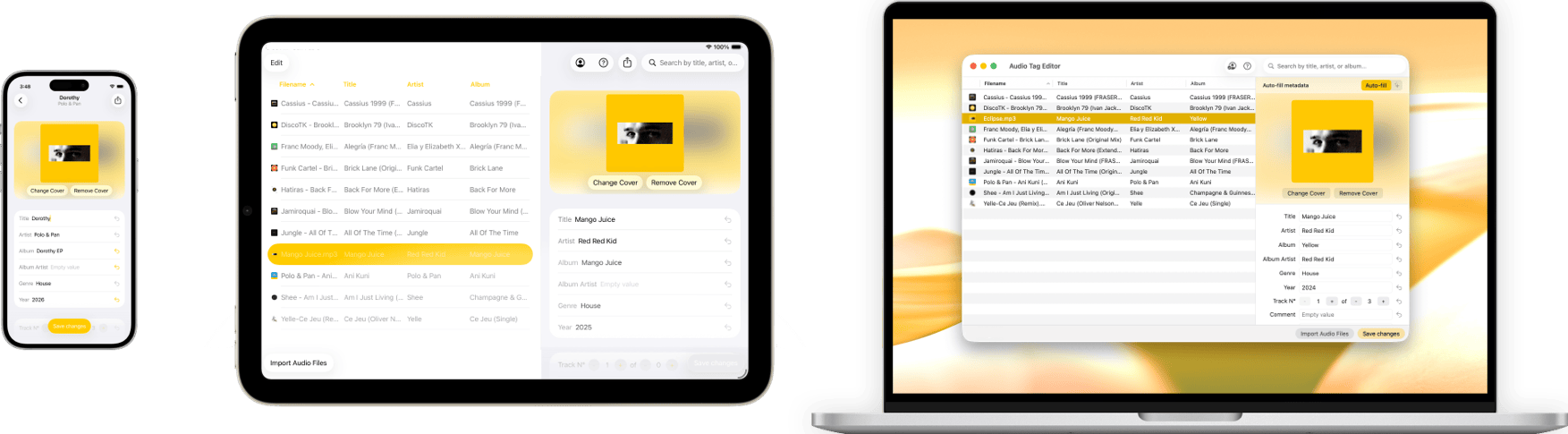 Update major audio files formats, MP3, MP4, FLAC, WAV, AIFF, and OGG. Tag existing tracks or freshly created ones without worrying about format-specific quirks.