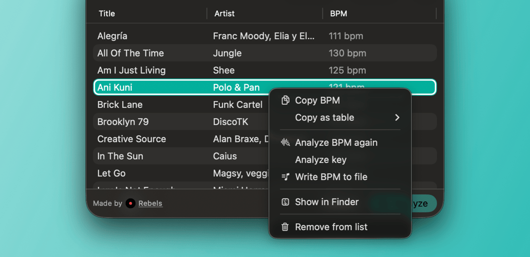 Analyze your entire music collection in one go with minimal CPU and memory usage. Process hundreds of tracks in seconds, with optional metadata writing to your files.