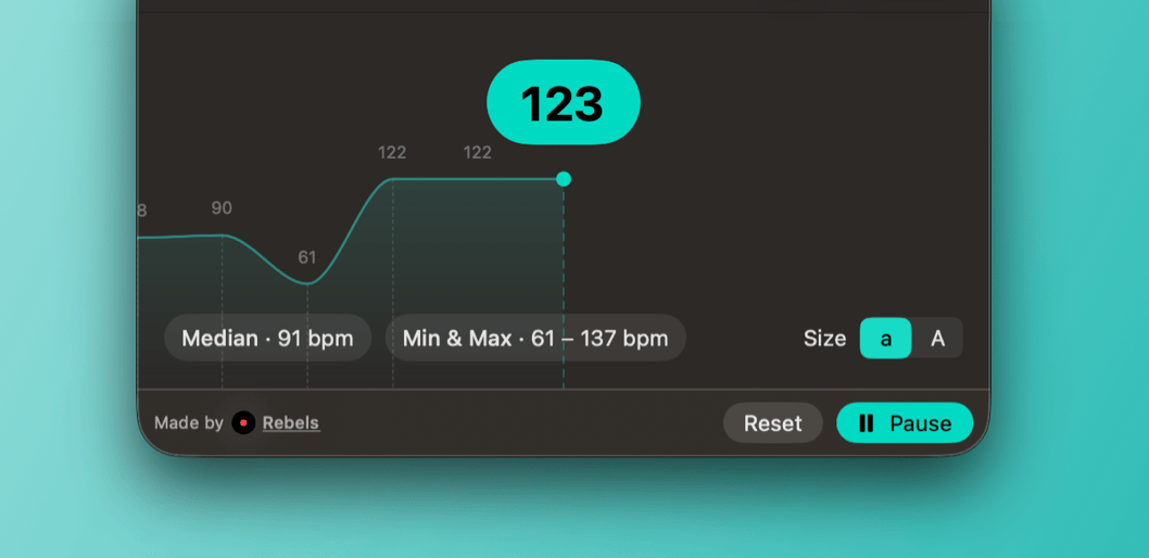 Detect tempo in real time from your device's microphone, completely offline. Track min, max, and median BPM on screen, or switch to full-screen mode to display the current tempo in big letters.