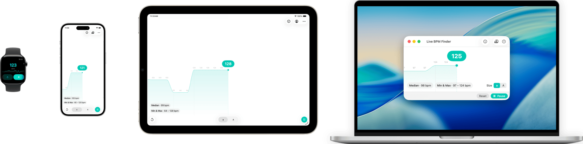 Live BPM Finder runs on Apple Watch, iPhone, iPad, and Mac. A single $4.99 purchase covers all four.