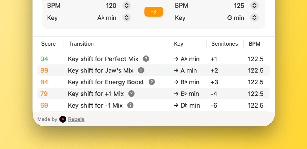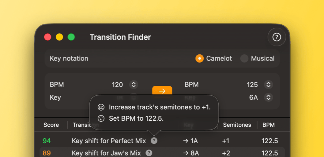 Find the best transitions for your DJ gear in one click, with optional key shifts to explore. Stay in control, experiment on your own terms, and get clear instructions to fuel your creativity.