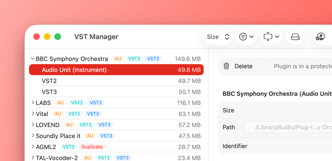 Scan your entire computer for AAX, Audio Unit, VST, and VST3 plugins in a flash. Add custom folders to cover additional locations and identify every plugin with detailed information.