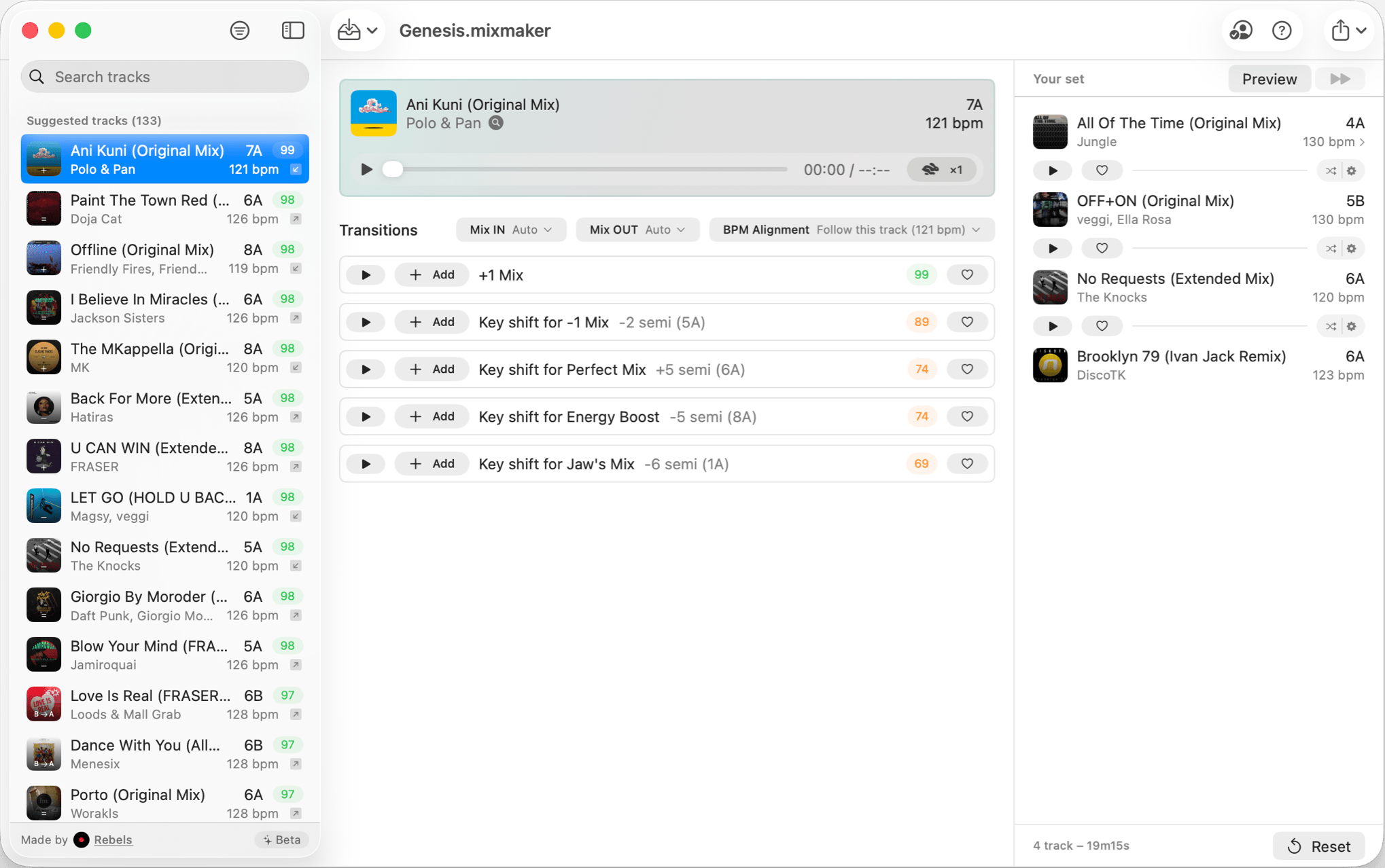 The standout capability is the combination of stem separation and key shifting. Stem separation splits any track into its vocal and instrumental elements, opening up blending possibilities that are normally only available in a full DAW. Key shifting adjusts a track's key to expand the pool of harmonically compatible transitions. Together, these two features push the planning phase significantly beyond what a purely organizational tool provides.