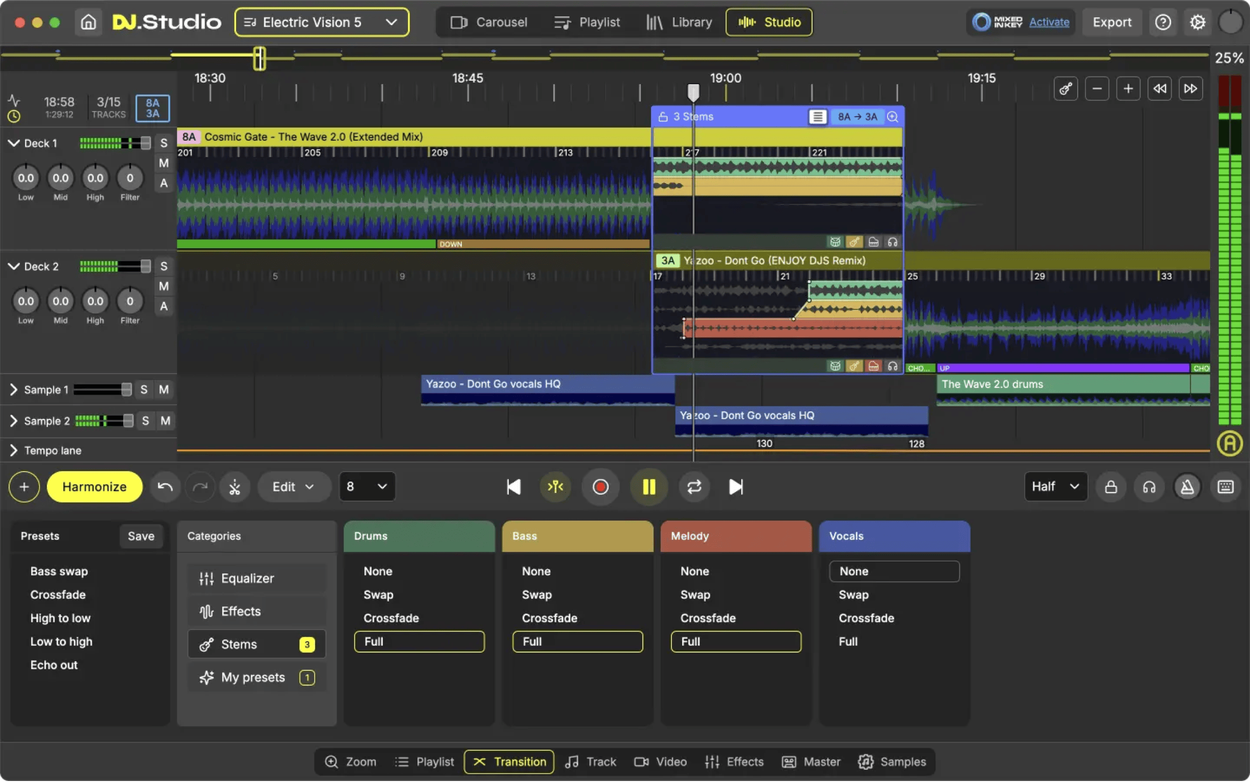 DJ.Studio is a full mixing and production environment. You bring in tracks, build a timeline, edit transitions with EQ and effects, and export a finished mix recording as audio or video. Direct upload to Mixcloud, SoundCloud, and YouTube is built in. Stem separation on the Pro+ tiers lets you isolate individual track elements for mashups and creative transitions.